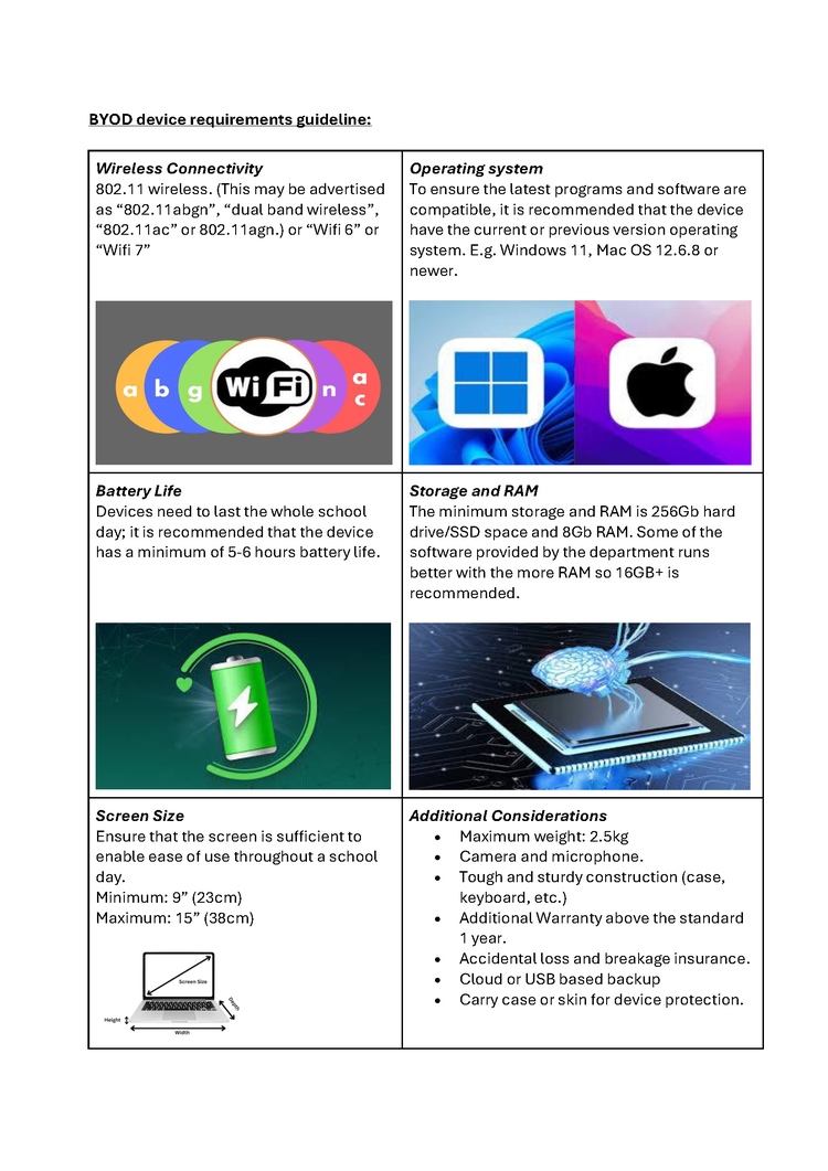 As part of our BYOD Program, all students are required to bring their own laptop device to school each day. Having a personal device supports learning across all subjects and ensures students can access online resources, complete classwork, and collaborate with their peers.